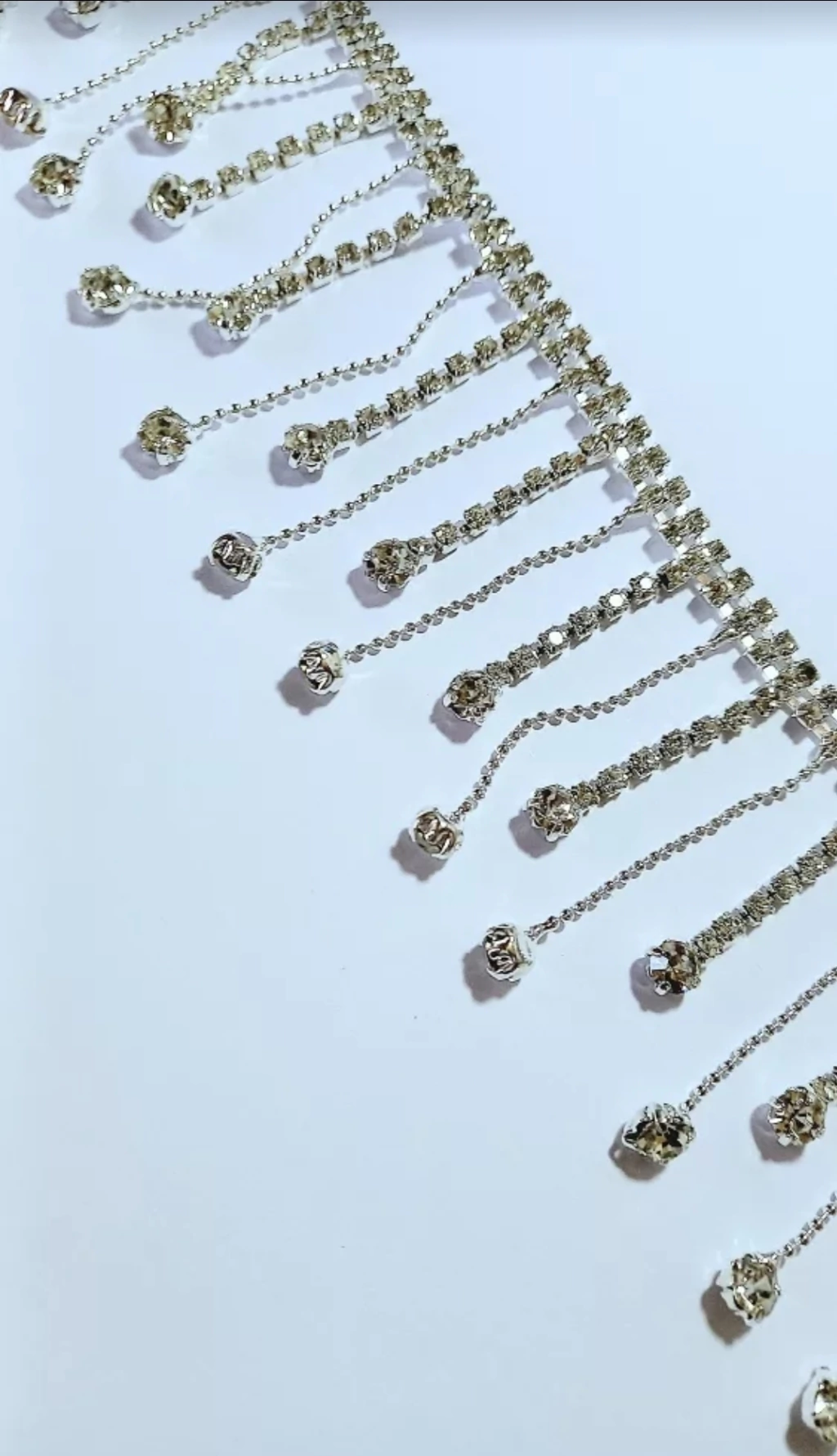 Fita Galão strasss na cor prata cristal brilhante medindo 5 centímetros de largura por 1 (um )metros de comprimento, composição metal com bolinhas aplicado no tule branco transparente.